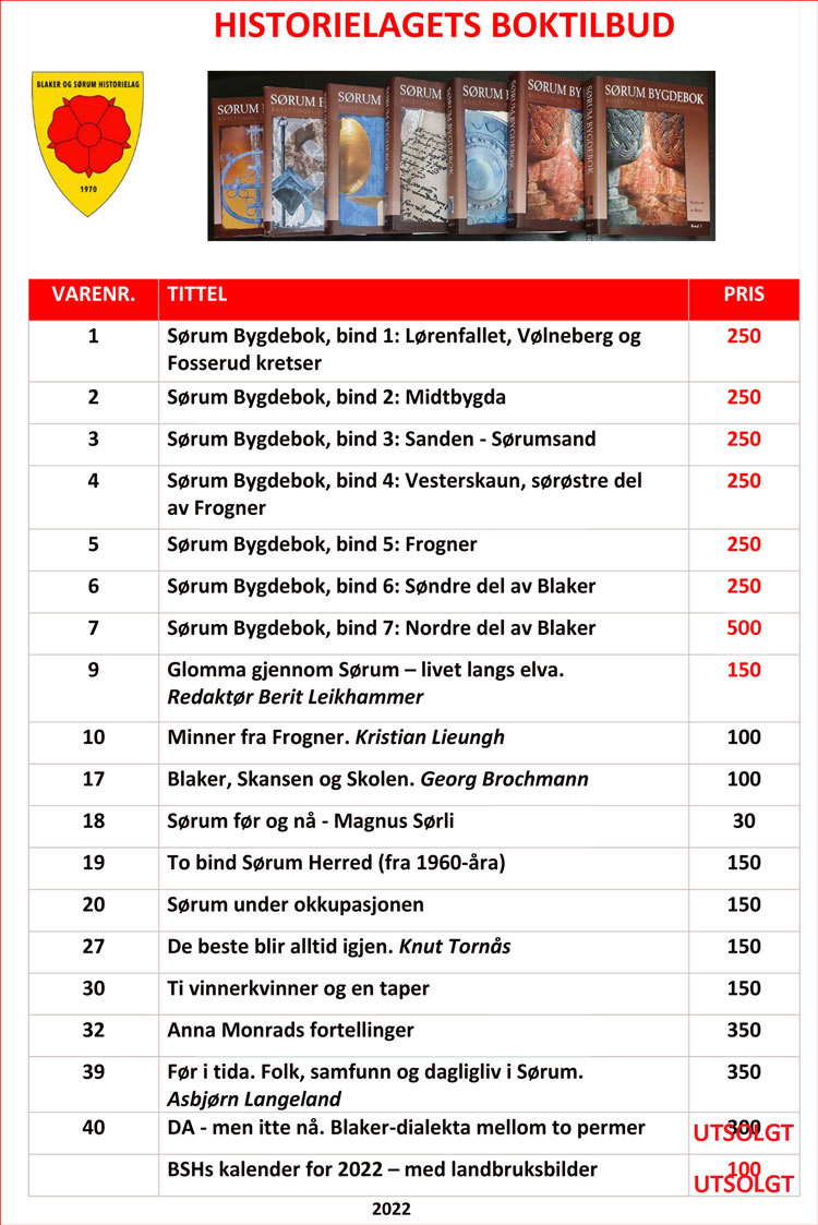 Bøker som selges hos Blaker og Sørum Historielag